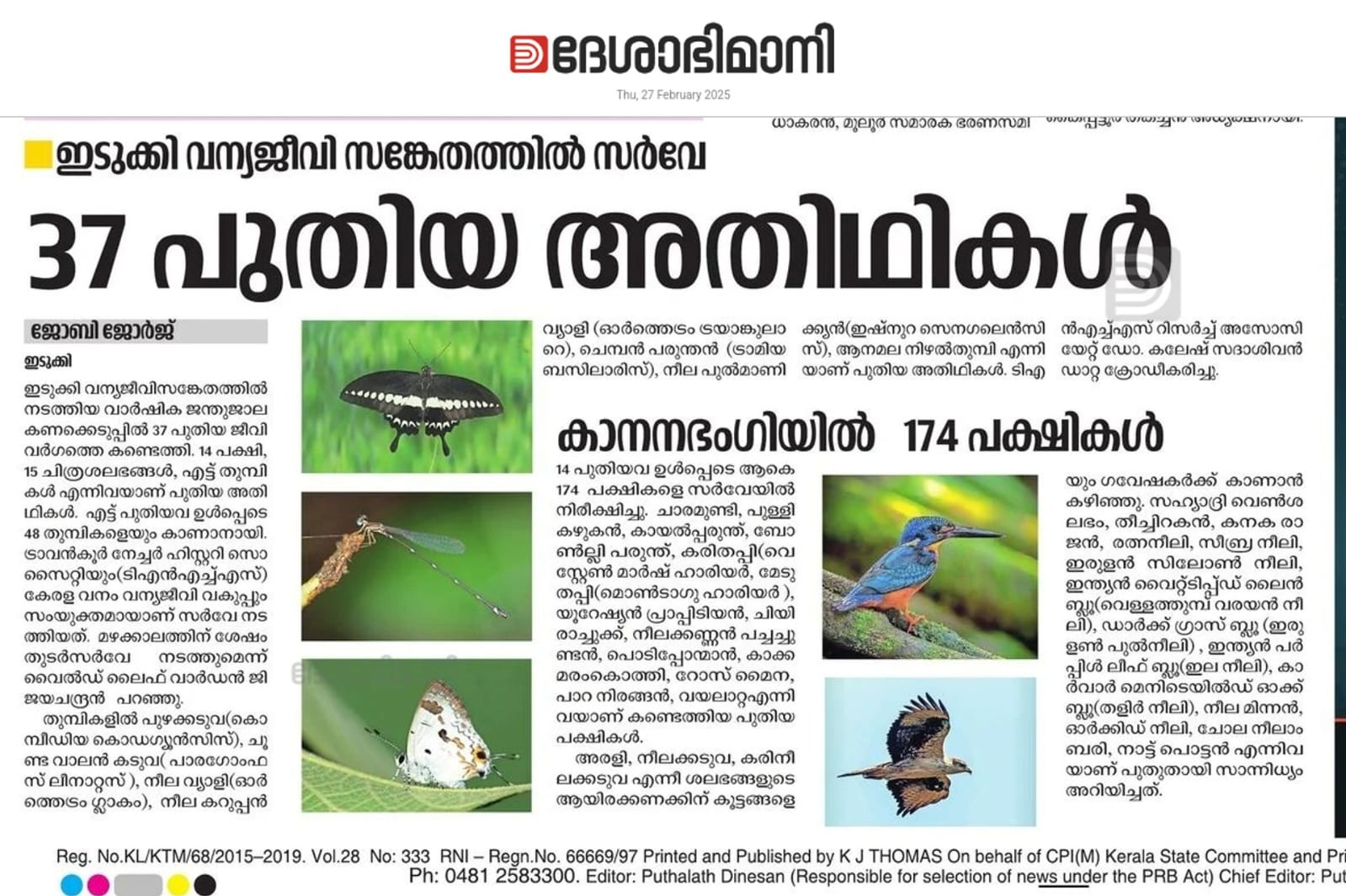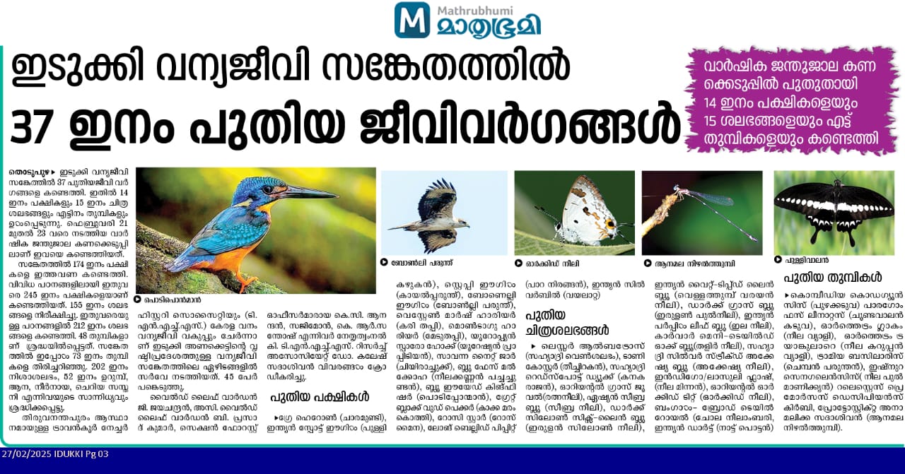 A total of 174 species of birds were observed in the survey including 14 new records. The additional species recorded were Grey Heron, Indian Spotted Eagle, Steppe Eagle, Bonelli's Eagle, Western Marsh-Harrier, Montagu's Harrier, Eurasian Sparrowhawk, Savanna Nightjar, Blue-Faced Malkoha, Blue-Eared Kingfisher, Great Black Woodpecker, Rosy Starling, Long-Billed Pipit, and Indian Silverbill. Currently with the additions the total number of birds in the Idukki Sanctuary is now 245. Other interesting findings are Legge’s Hawk Eagle, Black Baza, Rufous-Bellied Hawk Eagle, River Terns, Brown Fish-Owl, Forest Eagle Owl, and Great Eared Nightjar.